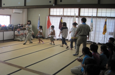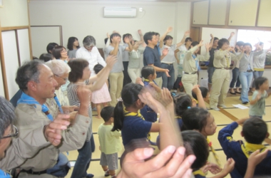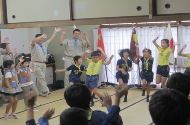 カブ隊の1・2組は合同でスカウトソングから「マルマルマル」を歌いながら、参加者みんなと踊りました。